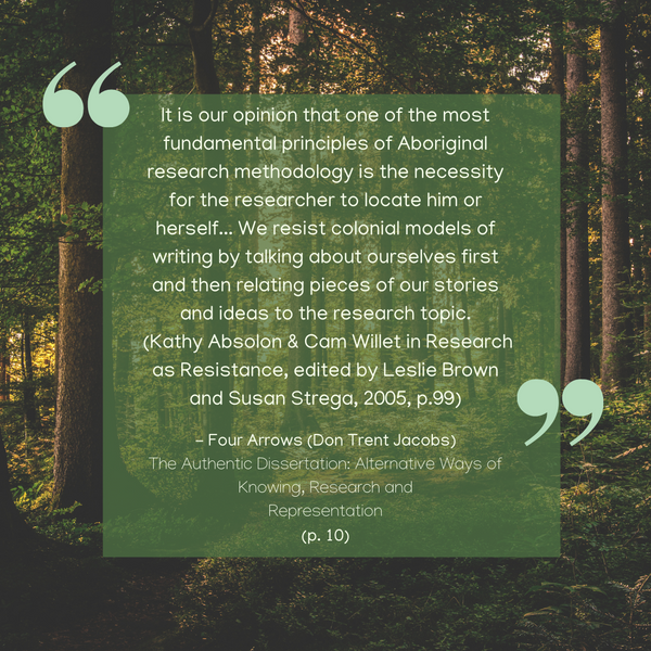 Before the video essay, I have included key quotes from Four Arrows' book on authentic dissertation. Reading his book in the fall semester helped me see the system of education I am a part of (as both a teacher & a student) in a different way, and once I did, there was no going back.